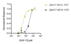 Figure 3. Qkine GDF-15 QC for SMAD2/3 (activin A/TGF-β) bioactivity. Bioactivity was determined using a SMAD2/3 luciferase reporter assay in HEK293T cells. Cells were treated (in triplicate) with a serial dilution of GDF-15 in the presence or absence of 10 µM of the activin A inhibitor follistatin. In this lot, contaminating activity was seen (green line), which was inhibited by follistatin (black line), confirming that contaminating activin A is causing this activity. Data from Qk017 lot #010 (not for sale).