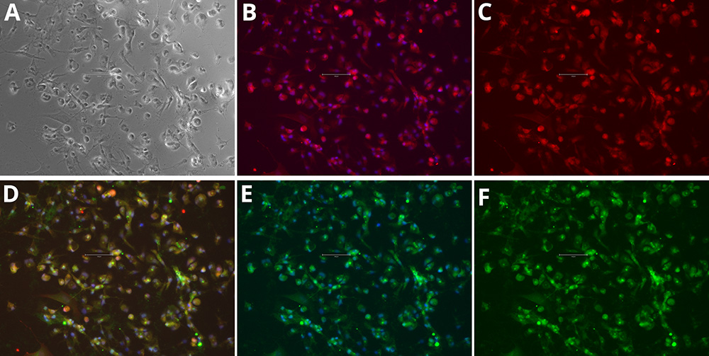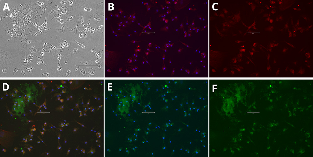 Figure 1. Immunocytochemistry of microglia markers in differentiated iPSCs. Phase Contrast [A], P2RY12 and Hoechst 33258 [B], P2RY12 [Red, C], IBA-1, P2RY12 and Hoechst 33258 [D], IBA-1 and Hoechst 33258 [E], IBA-1 [Green, F]. Images were acquired using the EVOS M5000 system (scale bar = 150 µm).