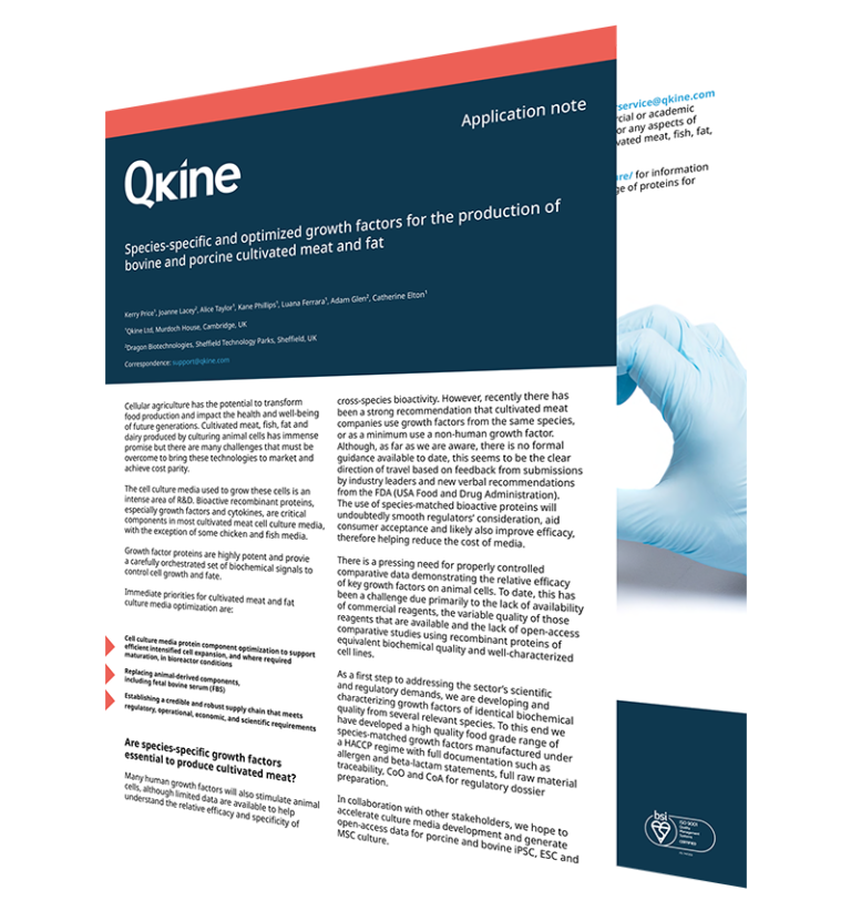 Qkine is dedicated to supporting the cellular agriculture industry by manufacturing high-purity and bioactive growth factors that are species-specific to cultivated cultures including porcine, bovine and fish.