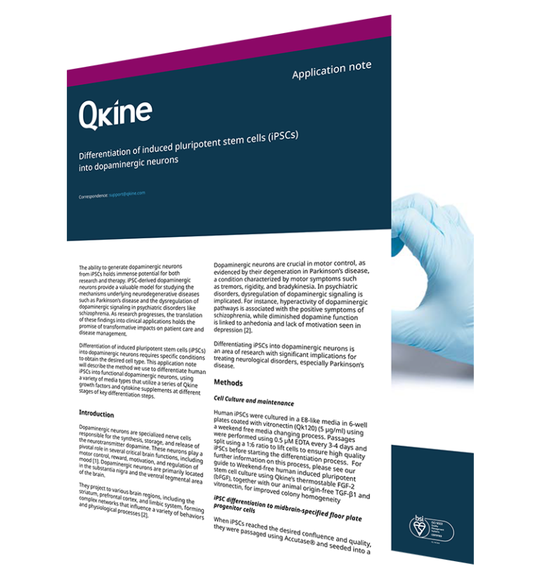 Differentiation of induced pluripotent stem cells (iPSCs) into dopaminergic neurons requires specific conditions to obtain the desired cell type. This application note describes the method we use to differentiate human iPSCs into functional dopaminergic neurons, using a variety of media types that utilize a series of Qkine growth factors; FGF8a (Qk059), BDNF (Qk050), GDNF (Qk051) and TGF-ß3 (Qk054) at different stages of key differentiation steps.