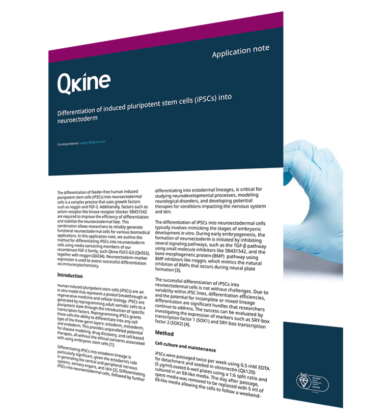 In this application note, we outline the method for differentiating iPSCs into neuroectoderm cells using media containing members of our recombinant FGF-2 family, such Qkine FGF2-G3 (Qk053), together with noggin (Qk034).