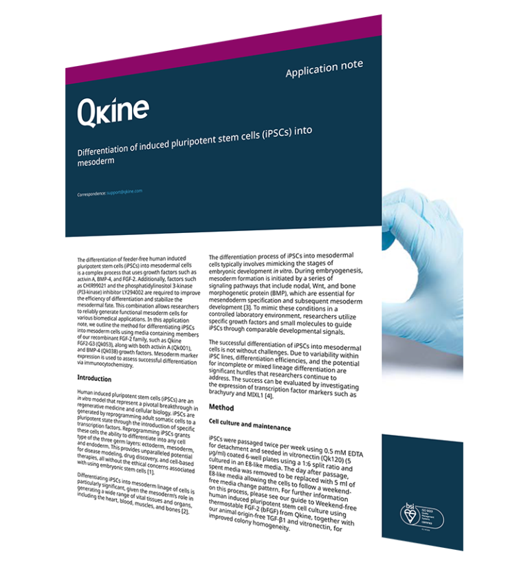 In this application note, we outline the method for differentiating iPSCs into mesoderm cells using media containing members of our recombinant FGF-2 family, such as Qkine FGF2-G3 (Qk053), along with both activin A (Qk001), and BMP-4 (Qk038) growth factors.