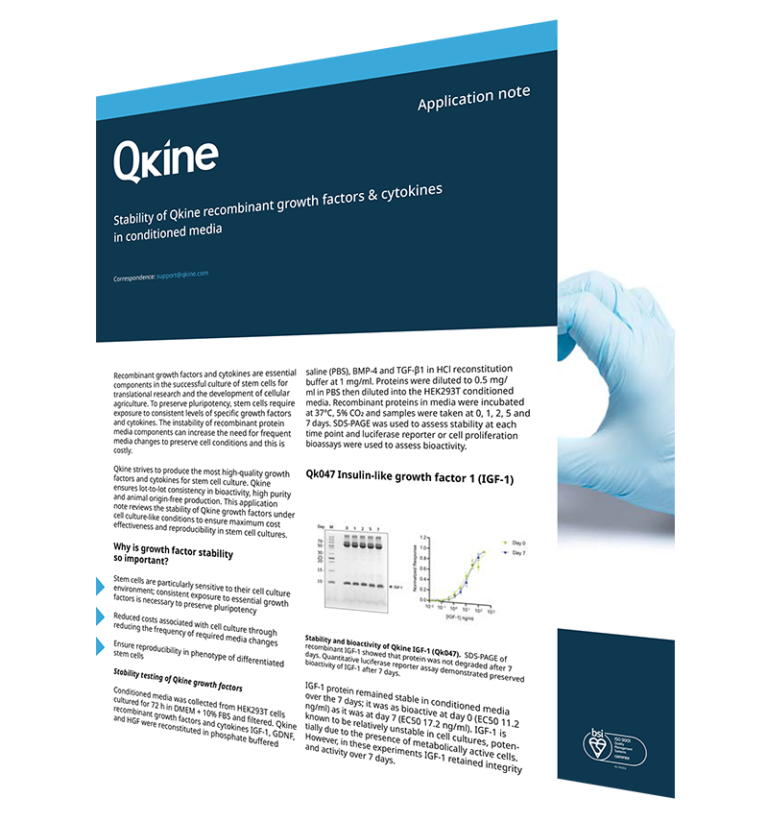 FGF-2 is a key component of stem cell media, it is known to be unstable under cell culture conditions, leading to the necessity for daily media changes to maintain culture conditions for stem cell culture. Although the thermo-instability of FGF-2 is well documented, the thermostability of other essential growth factors has not been investigated. This application note reviews the stability of Qkine growth factors (GM-CSF, IL-6, IGF-1, IGF1 LR3, GDNF, BMP-4, HGF NK1 and TGF-ß1 PLUS) under cell culture-like conditions to ensure maximum cost effectiveness and reproducibility in stem cell cultures.