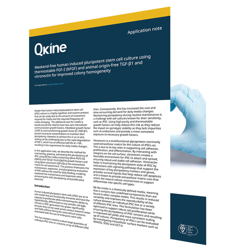 In this application note, we describe the method for maintaining, growing, and testing the pluripotency of iPSC using E8-like media containing Qkine FGF2-G3 (Qk053) and TGF-β1 PLUS (Qk010) growth factors and using Qkine vitronectin (Qk120) as the extracellular matrix for cell attachment. This process showcases the maintenance, expansion, and pluripotency evaluation of iPSC without the need for daily feeding, enabling weekend-free maintenance and expansion while preserving the cells’ pluripotency and proliferative potential.