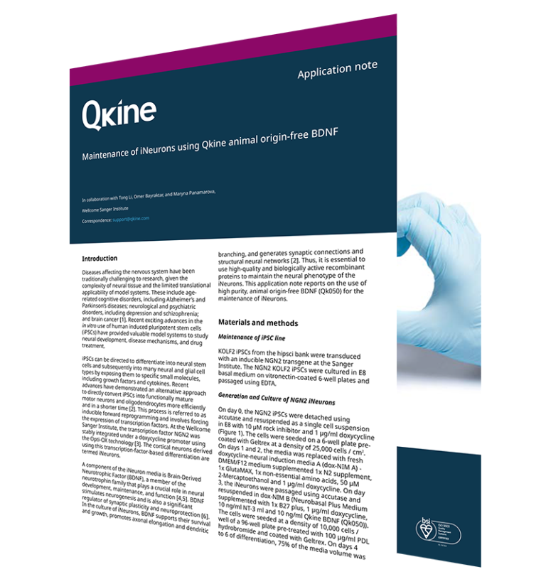 It is essential to use high-quality and biologically active recombinant proteins to maintain the neural phenotype of iNeurons. This application note reports on the use of high purity, animal origin-free BDNF (Qk050) for the maintenance of iNeurons.