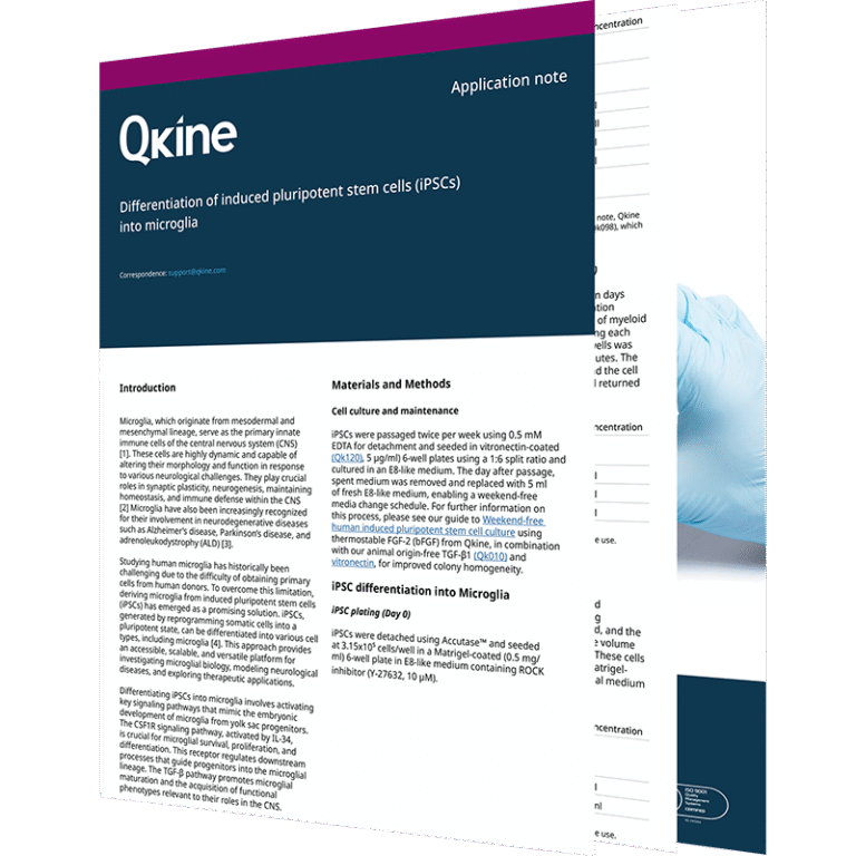 In this application note, we demonstrate that high purity, animal origin-free growth factors from Qkine – including BMP-4 (Qk038), FGF2-G3 (Qk052), SCF (Qk078), VEGF 165 (Qk048), IL-3 (Qk090), M-CSF (Qk075), Flt3 ligand (Qk087), IL-34 PLUSTM (Qk091) and GM-CSF (Qk076) – support robust and reliable differentiation of iPSCs into microglial cells.