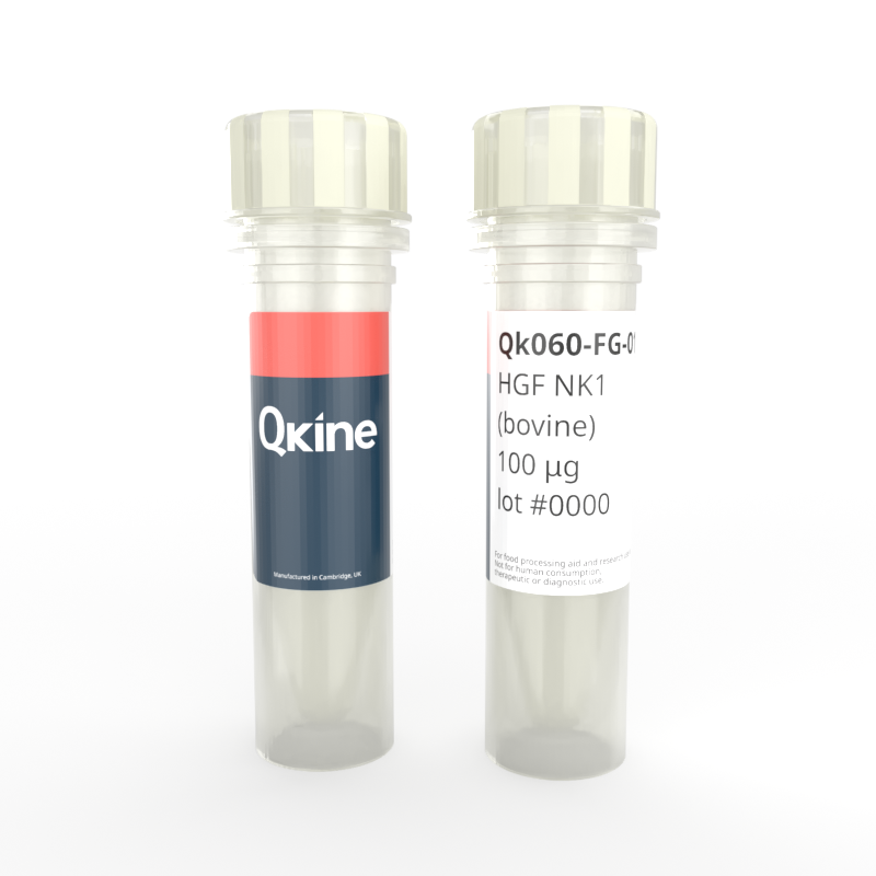 Recombinant bovine HGF NK1 protein is a potent, high-purity NK1 isoform of bovine hepatocyte growth factor (HGF). Bovine HGF differs from human HGF at several key amino acid residues that are predicted to affect bioactivity and receptor binding. Use of species-specific HGF growth factor will facilitate media optimization for cellular agriculture (cultivated meat) and veterinary applications. Also available is Qk061-FG porcine HGF (NK1). The highly scalable animal-free manufacture and enhanced bioactivity make this suitable for chemically-defined media and reproducible scale-up.