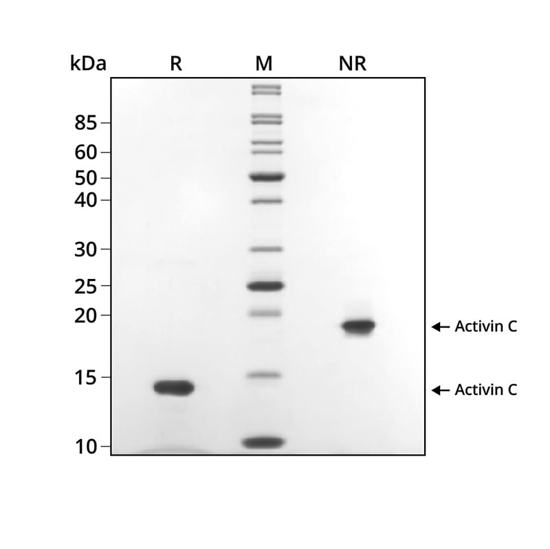 Recombinant activin C migrates at approximately 14 kDa (monomer) in reduced (R) and approximately 18 kDa (dimer) non-reduced (NR) conditions. No contaminating protein bands are present. The purified recombinant protein (3 µg) was resolved using 15% w/v SDS-PAGE in reduced (+β-mercaptoethanol, R) and non-reduced (NR) conditions and stained with Coomassie Brilliant Blue R250. Data from Qk026 lot #204801.