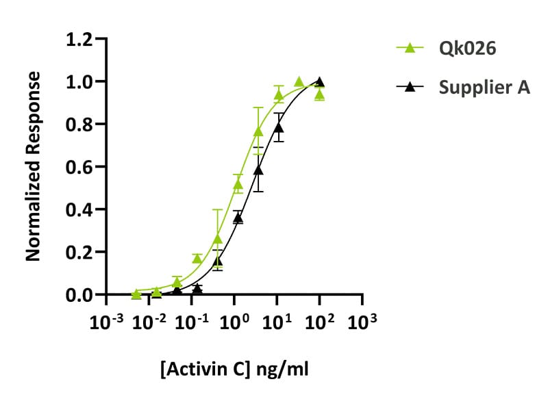 Qkine activin C was slightly more bioactive than mammalian cell-expressed activin C from an alternative supplier. Activin C activity was determined using a Smad reporter assay in HEK293 cells co-transfected with the activin C co-receptor ALK7. HEK293 cells were treated in triplicate with a serial dilution of Qkine activin C (Qk026, green) or alternative supplier activin C (Supplier A, black) for 6 hours. Firefly activity was measured and normalized to the control Renilla luciferase activity. Data from Qk026 lot #204801.