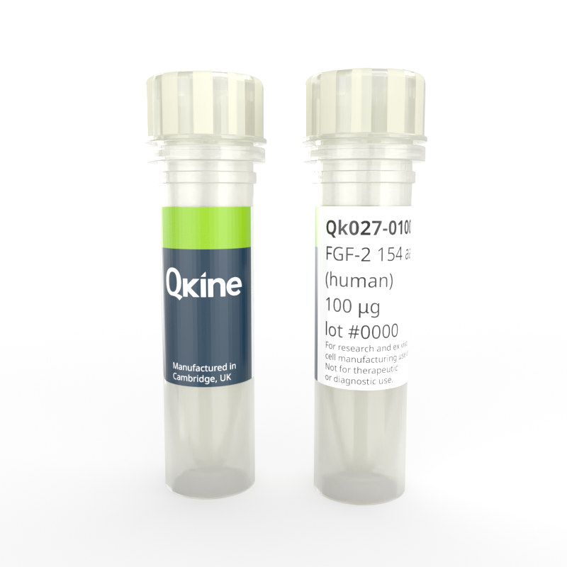 FGF-2 and TGF-β1 are required for maintenance of iPSC in feeder free culture, Qkine produces high quality, bioactive and animal origin-free FGF-2 (Qk027) and TGF-β1 (Qk010) for stem cell culture. However, FGF-2 has poor thermostability in culture so, to prevent the need for daily media changes, Qkine FGF2-G3 has been engineered to be highly thermostable allowing weekend-free culture of iPSCs.