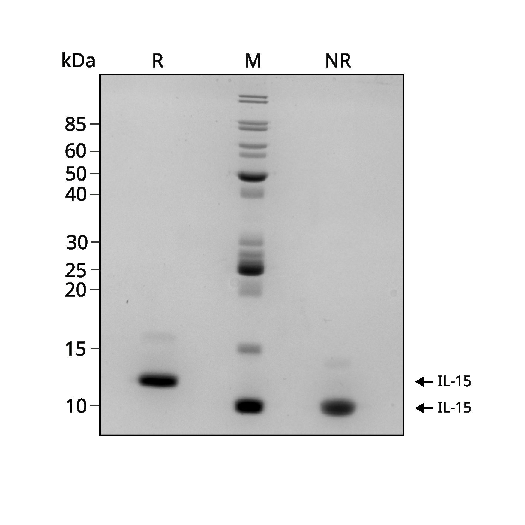 Recombinant IL-1β migrates as a major band at 17.4 kDa in non-reducing (NR) conditions. The higher molecular weight minor band is the dimeric form. Upon reduction (R), only the 17.4 kDa band is visible. No contaminating protein bands are present. Purified recombinant protein (3 µg) was resolved using 15% w/v SDS-PAGE in reduced (+β-mercaptothanol, R) and non-reduced (NR) conditions and stained with Coomassie Brilliant Blue R250. Data from Qk101 batch #204587.