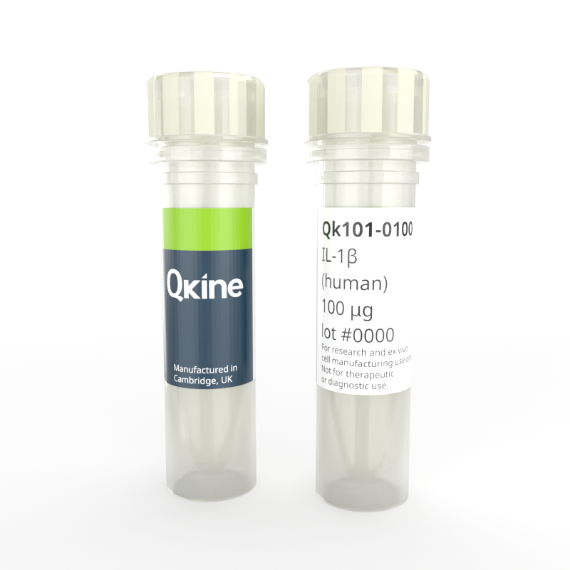 Qkine human IL-1β is a monomer of a molecular weight of 17.3 kDa. This protein is animal origin-free, carrier protein-free, and tag-free to ensure a homogenous population with exceptional lot-to-lot consistency. IL-1β is suitable for reproducible, high-quality hematopoietic stem cells and more specific lineages.