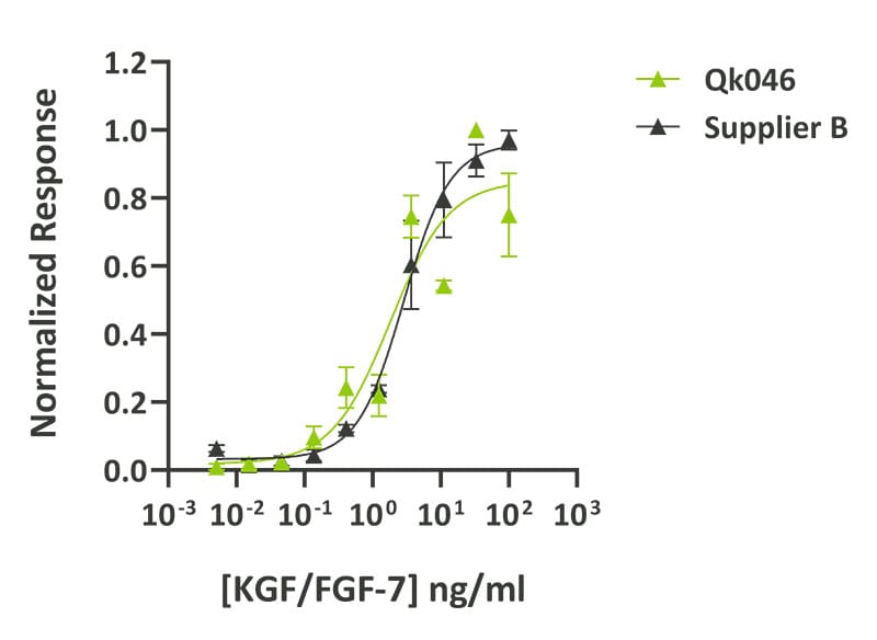 KGF (FGF-7) from Qkine (Qk046) and a major supplier have equivalent bioactivity. Qk046 KGF (FGF-7) lot #104425 and KGF from another supplier were compared in the same assay plate with EC50s of 2.0 ng/ml and 3.7 ng/ml respectively.