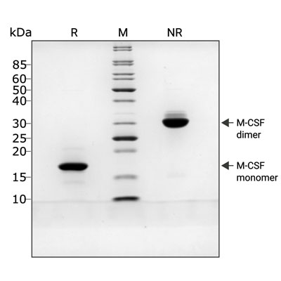 Recombinant M-CSF migrates as a major band at approximately 36 kDa (dimer) in non-reducing (NR) conditions. Upon reduction (R), only the monomer band at approximately 18 kDa is visible. No contaminating protein bands are present. The purified recombinant protein (3 µg) was resolved using 15% w/v SDS-PAGE in reduced (+β-mercaptoethanol, R) and non-reduced (NR) conditions and stained with Coomassie Brilliant Blue R250. Data from Qk075 batch #204507.