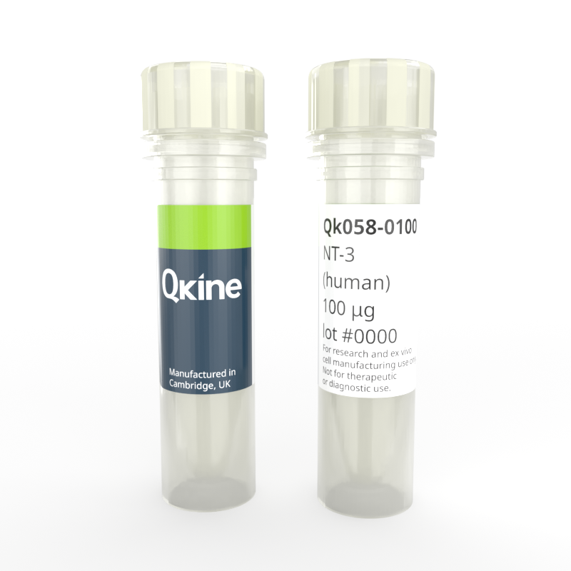 Qkine NT-3 protein is a non-covalently linked homodimer with a molecular weight of 27.3 kDa, animal origin-free (AOF), carrier-free, tag-free, and non-glycosylated to ensure its purity with exceptional lot-to-lot consistency. It is suitable for the culture of reproducible and high-quality cortical neurons and oligodendrocytes.