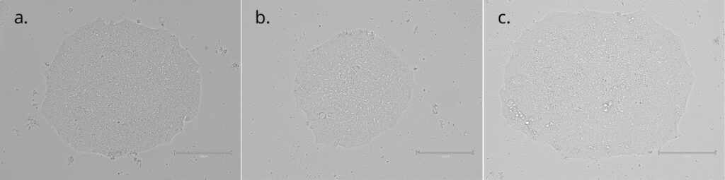 Imaging of iPSC colonies grown on Qkine vitronectin coated plates in E8-like media retained their highly preserved morphological appearance. (A) after initial seeding and 3 days in culture; (B) After 1 passage and 7 days in culture; (C) After 3 passages and 14 days in culture (scale bar = 150 µm). 6-well plates were coated with 5 µg/ml Qk120 vitronectin protein lot #204660.