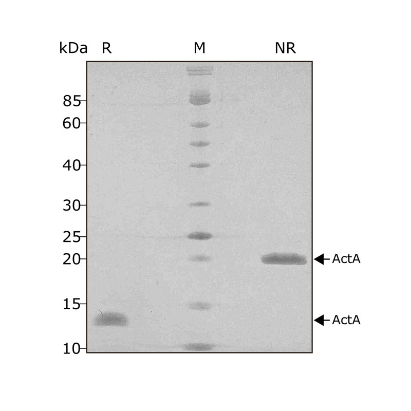 Activin A PLUS™ migrates as a single band at 24 kDa in non-reducing (NR) and 13 kDa as a single monomeric species upon reduction (R). No contaminating protein bands are visible. Purified recombinant protein (7 µg) was resolved using 15% w/v SDS-PAGE in reduced (+β-mercaptothanol, R) and non-reduced conditions (NR) and stained with Coomassie Brilliant Blue R250. Data from Qk005 lot #010.