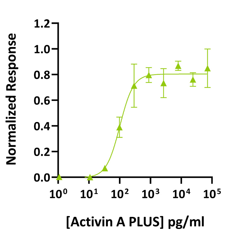 Activin A PLUS™ activity was determined using an activin-responsive firefly luciferase reporter in HEK293T cells. in triplicate) with a serial dilution of activin A for 6 hours. Firefly luciferase activity is measured and normalized to the control Renilla luciferase activity. EC50 = 0.103 ng/ml (4.24 pM). EC50 is within the expected range of 6 ± 2 pM. Data from Qk005 lot #104344.