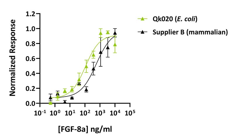 Qkine animal origin-free FGF-8a is more biologically active than mammalian-origin comparable alternative. Quantitative luciferase assay with Qkine FGF-8a (Qk020, green) and alternative supplier FGF-8a (Supplier B, black). Cells were treated in triplicate with a serial dilution of FGF-8a for 3 hours in the presence of 10 µg/ml heparin. Firefly luciferase activity was measured and normalized to control Renilla luciferase activity.