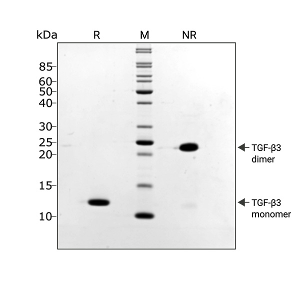 TGF-β3 migrates as a single band at 25 kDa in non-reducing (NR) conditions and 13 kDa upon reduction (R). No contaminating protein bands are visible. Purified recombinant protein (3 µg) was resolved using 15% w/v SDS-PAGE in reduced (+β-mercaptothanol, R) and non-reduced (NR) conditions and stained with Coomassie Brilliant Blue R250. Data from Qk054 batch #104369.