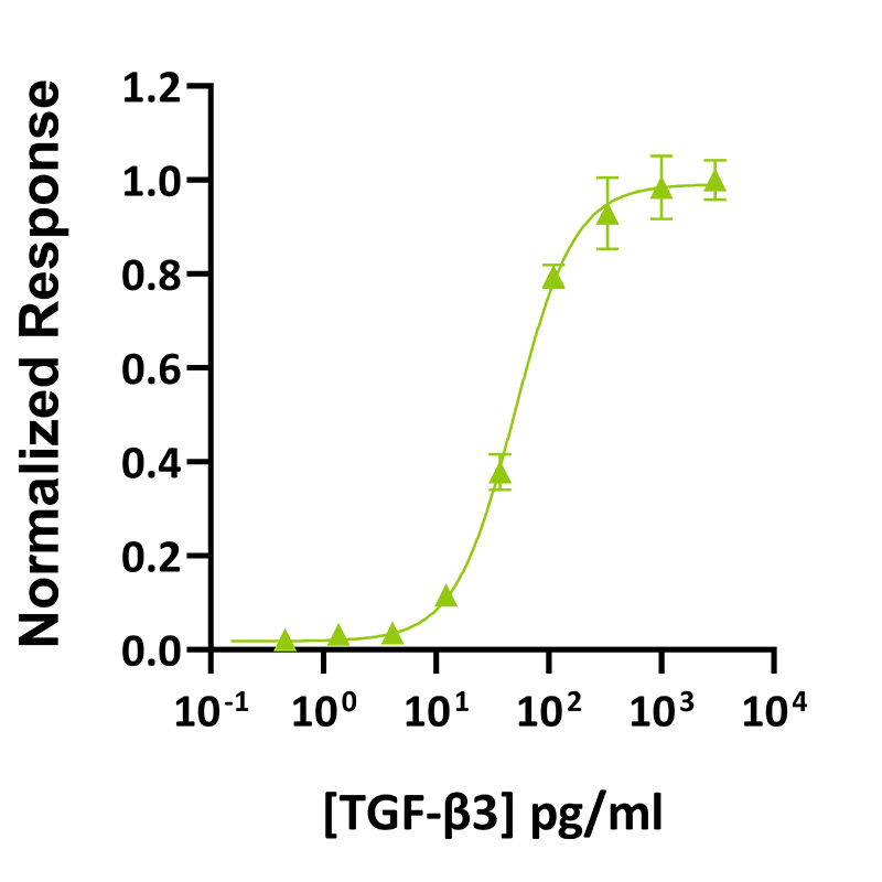 TGF-β3 activity was determined using a TGF-β3 responsive firefly luciferase reporter in HEK293T cells. EC50 = 50 pg/ml. Bioactivity was determined using a TGF-β3 responsive firefly luciferase reporter in HEK293T cells. Cells were treated (in triplicate) with a serial dilution of TGF-β3 for 6 hours. Firefly luciferase activity was measured and normalized to the control Renilla luciferase activity. Data from Qk054 batch #104369.