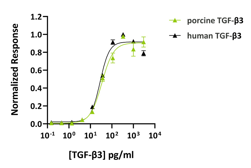 Recombinant porcine TGF-β3 activity was determined using a TGF-β3-responsive luciferase assay. Transfected HEK293 cells were treated in triplicate with a serial dilution of porcine TGF-β3 for 6 hours. Firefly activity was measured and normalised to the control Renilla luciferase activity. Data from Qk084 lot 204635. EC50 = 41 pg/ml (1.6 pM)