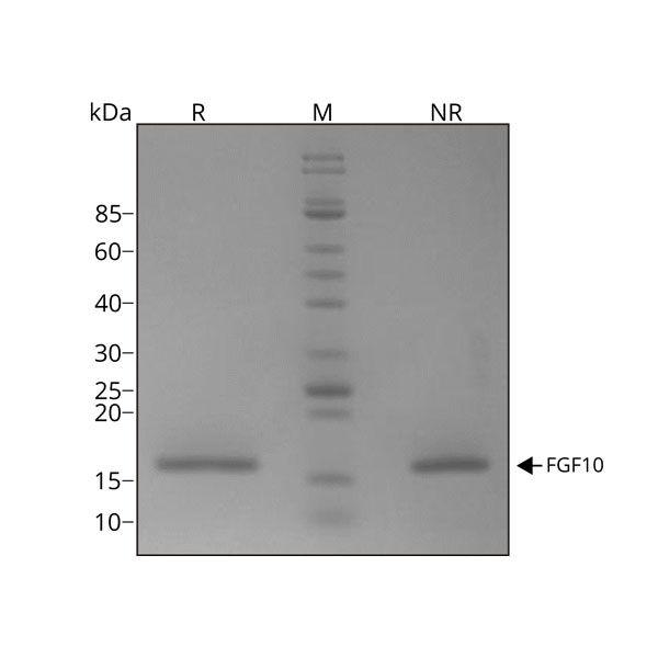 Fibroblast growth factor 10 (FGF-10) protein promotes lung organoid formation and induces branching morphology. FGF-10 protein is used widely in organoid culture, embryonic stem cell (ESC) and induced-pluripotent stem cell (iPSC) differentiation, and for the study of epithelial to mesenchymal transition (EMT) and tumor metastasis.