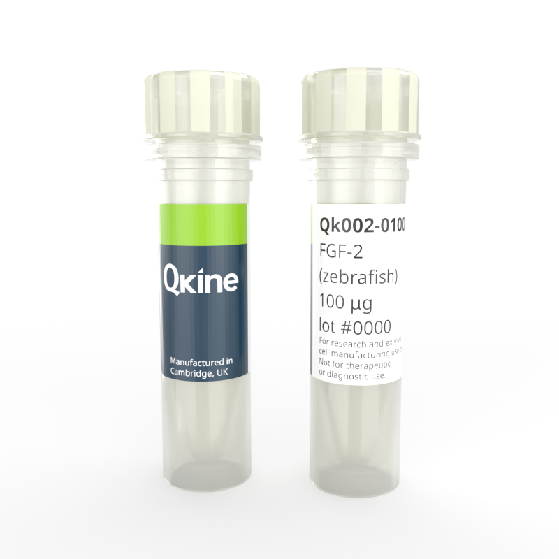 High purity 17 kDa FGF-2 protein, animal origin-free (AOF) and carrier-protein free (CF). This version of recombinant zebrafish FGF-2 is used by the core facility at the Cambridge Stem Cell Institute, UK and historically by many of the stem cell groups based at University of Cambridge.